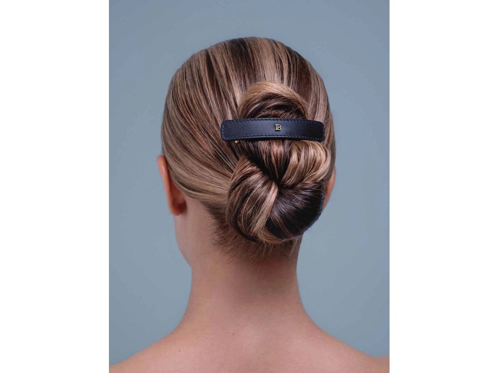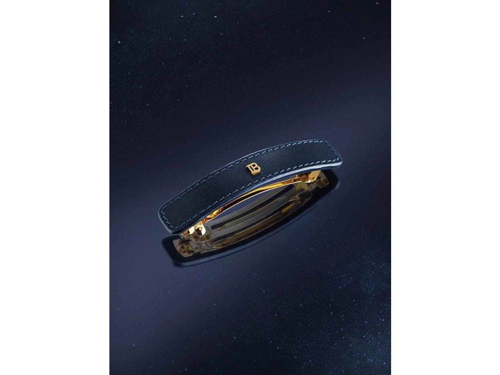 Charakteristická spona od Balmain Hair, vyrobená z vysoko kvalitnej kože sýtej modrej farby safíru, s logom „B“ pozláteným 18-karátovým zlatom. Tento doplnok spája odvahu a eleganciu a je tak predurčený k jemnému, no zároveň výnimočnému sebavyjadreniu.